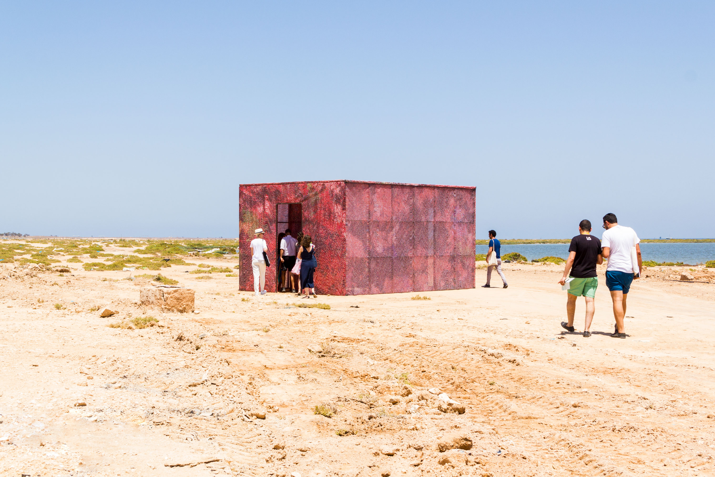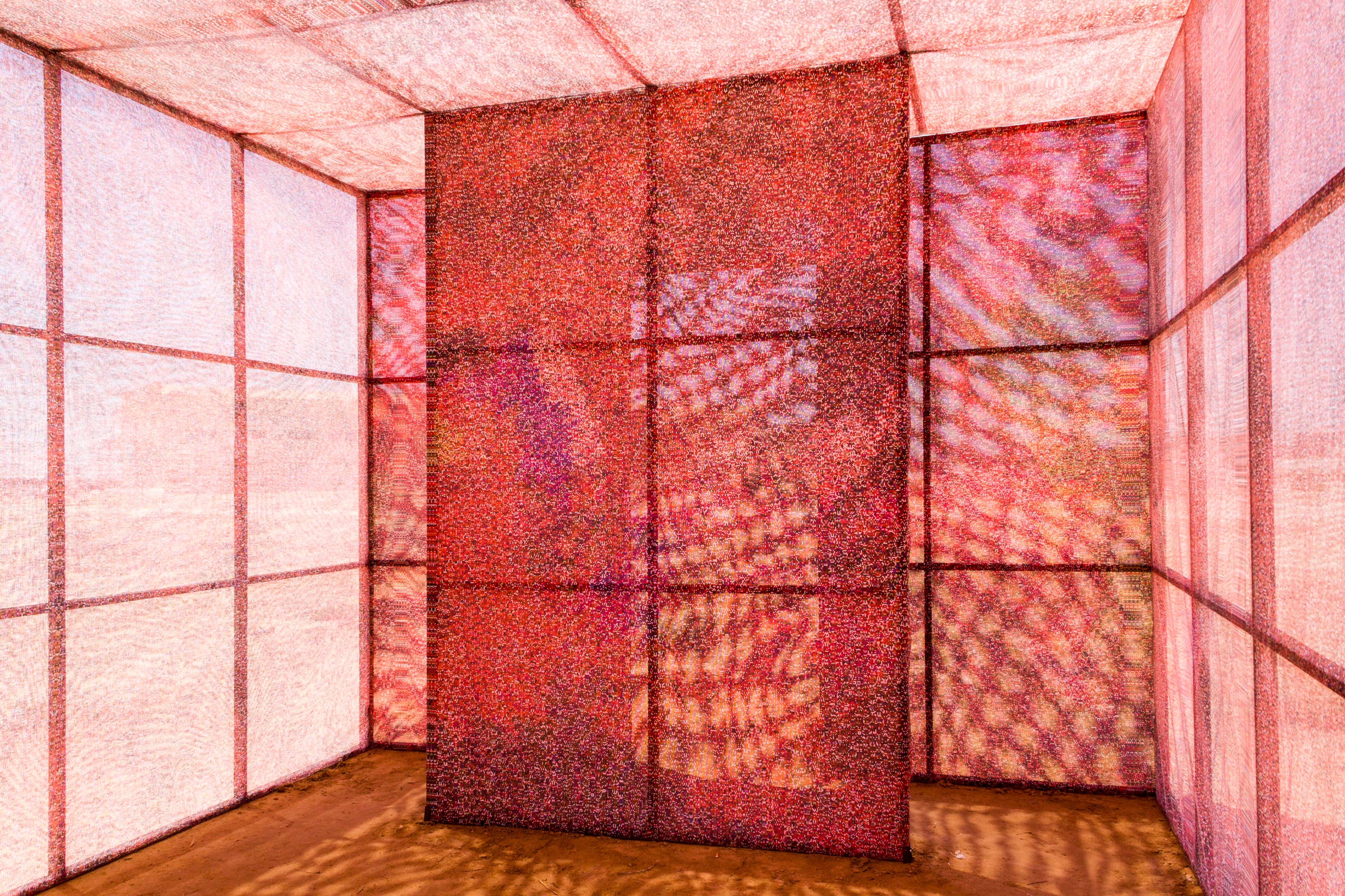 Présenté cet été, #Red-Screen Temple constitue peut-être l’aboutissement de cette réflexion sur le statut même de ce monde digital fait d’algorithmes et de données en masses innombrables. À force de ne pouvoir le comprendre, le dénombrer, le représenter, l’homme parvient aujourd’hui à une forme de divinisation du digital, phénomène surnaturel qu’il s’agirait de révérer — ou d’abhorrer — plutôt que de comprendre. C’est donc un temple de matière digitale que Mathieu Merlet Briand a choisi d’ériger à Kerkennah, en Tunisie. Vénérer, c’est accepter que l’œuvre face à soi constitue une force qu’on ne peut ni comprendre, ni infléchir. Lorsque de tels temples furent érigés ici, vingt siècles plus tôt, c’est la nature même qu’ils tentaient d’amadouer. En répétant ce geste, Mathieu Merlet Briand nous invite à repenser notre rapport au « Google God » — expression d’Ariel Kyriou — en acceptant son existence désormais autonome. Voir par-delà le mythe, c’est nous permettre de disjoindre le digital-même de l’idéologie qui lui est aujourd’hui associée. À raison, puisque ses entrepreneurs ne cachent pas leur attachement à un néolibéralisme où l’on peine à trouver la place de chacun. Et ainsi, l’œuvre de Mathieu Merlet Briand, plutôt que de dénoncer un état de fait, préfigure une ère où le digital sera pleinement neutre et décentralisé, plus poreux et fluide encore qu’aujourd’hui.